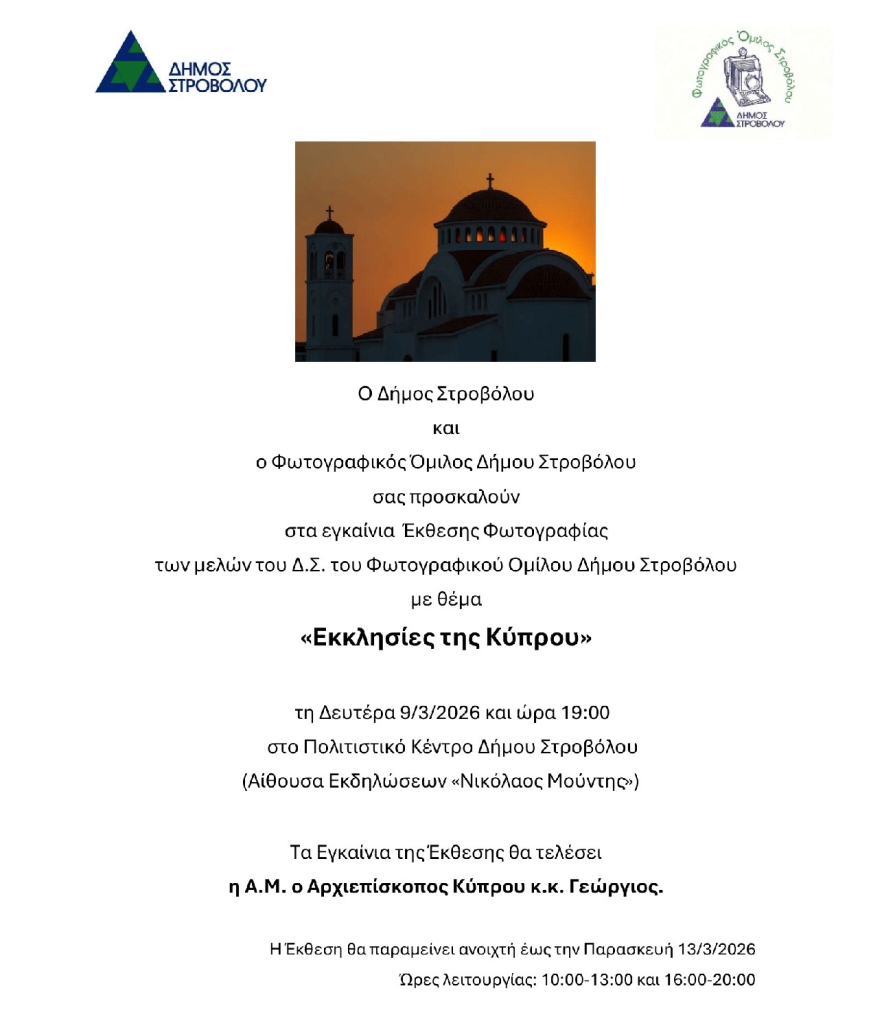 Έκθεσης Φωτογραφίας μελών Δ.Σ. του Φωτογραφικού Ομίλου Δήμου Στροβόλου με θέμα «Εκκλησίες της Κύπρου», 9/3/26